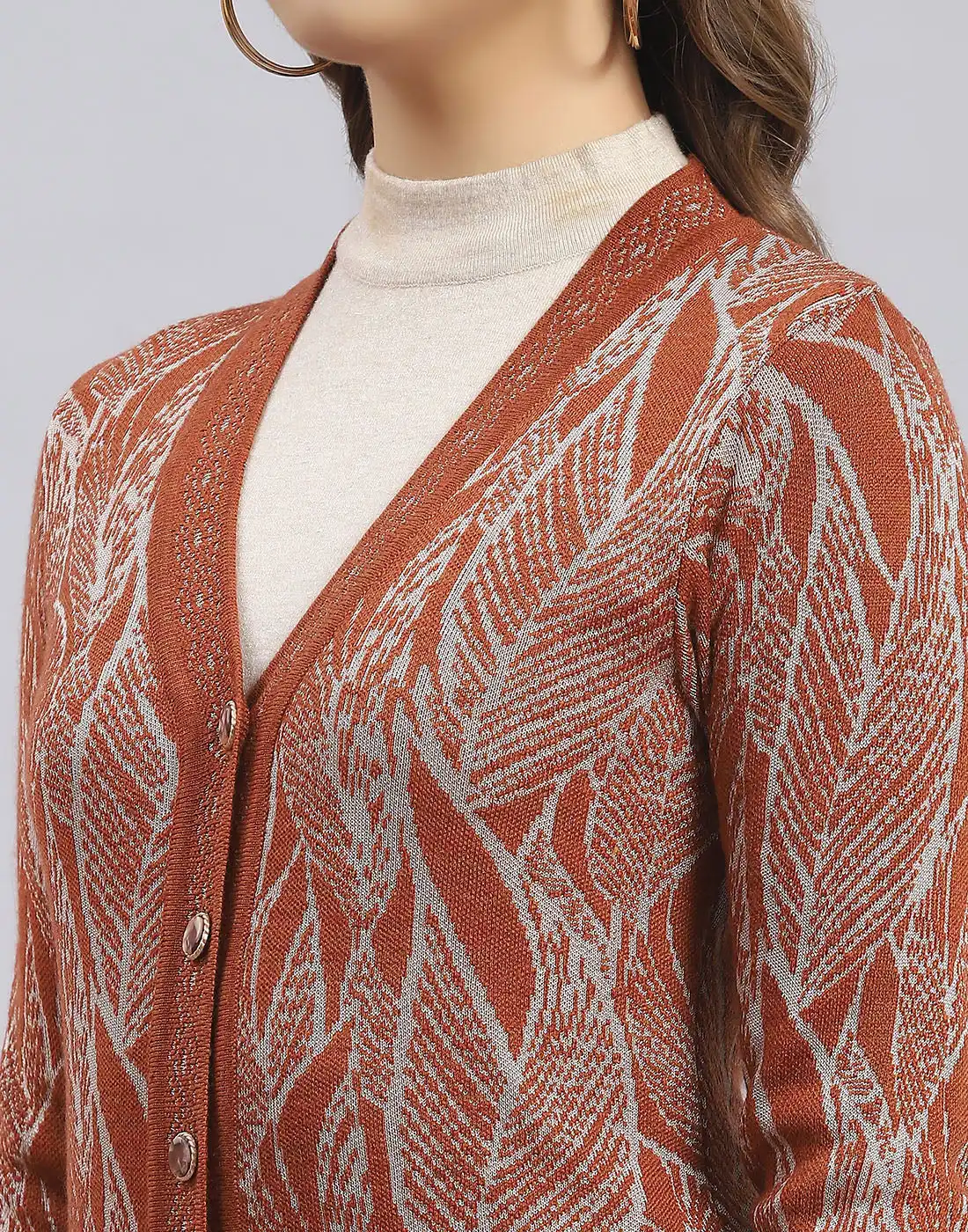 Women Brown Self Design V Neck Full Sleeve Sweater