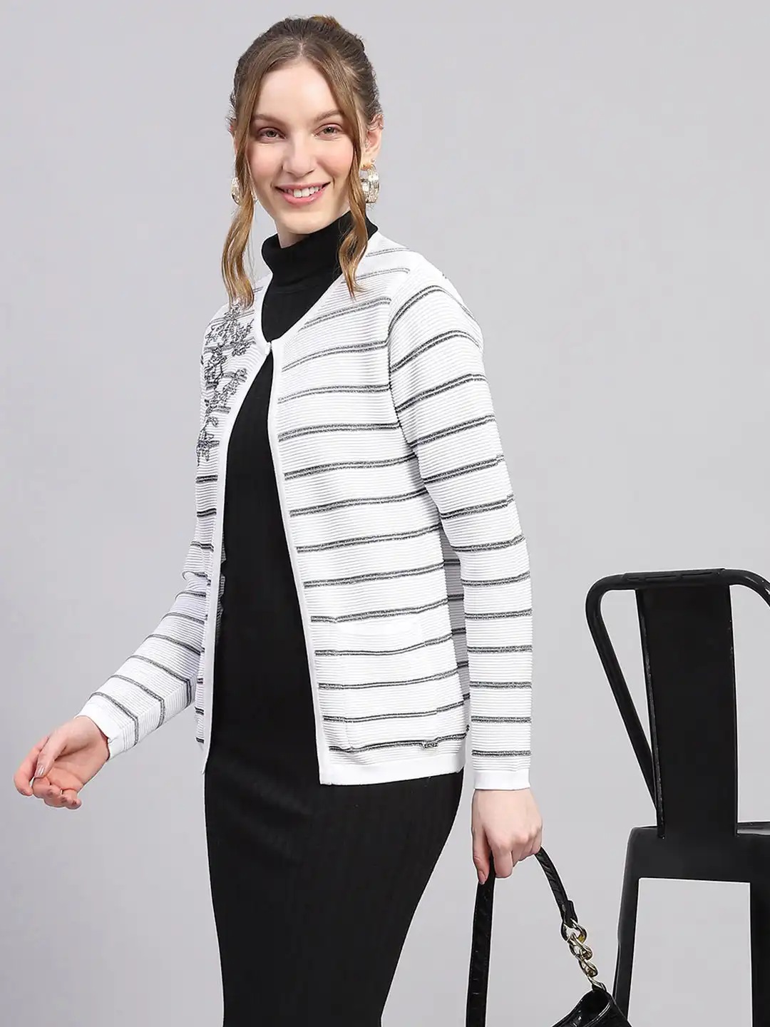 Women White Stripe Round Neck Full Sleeve Cardigan
