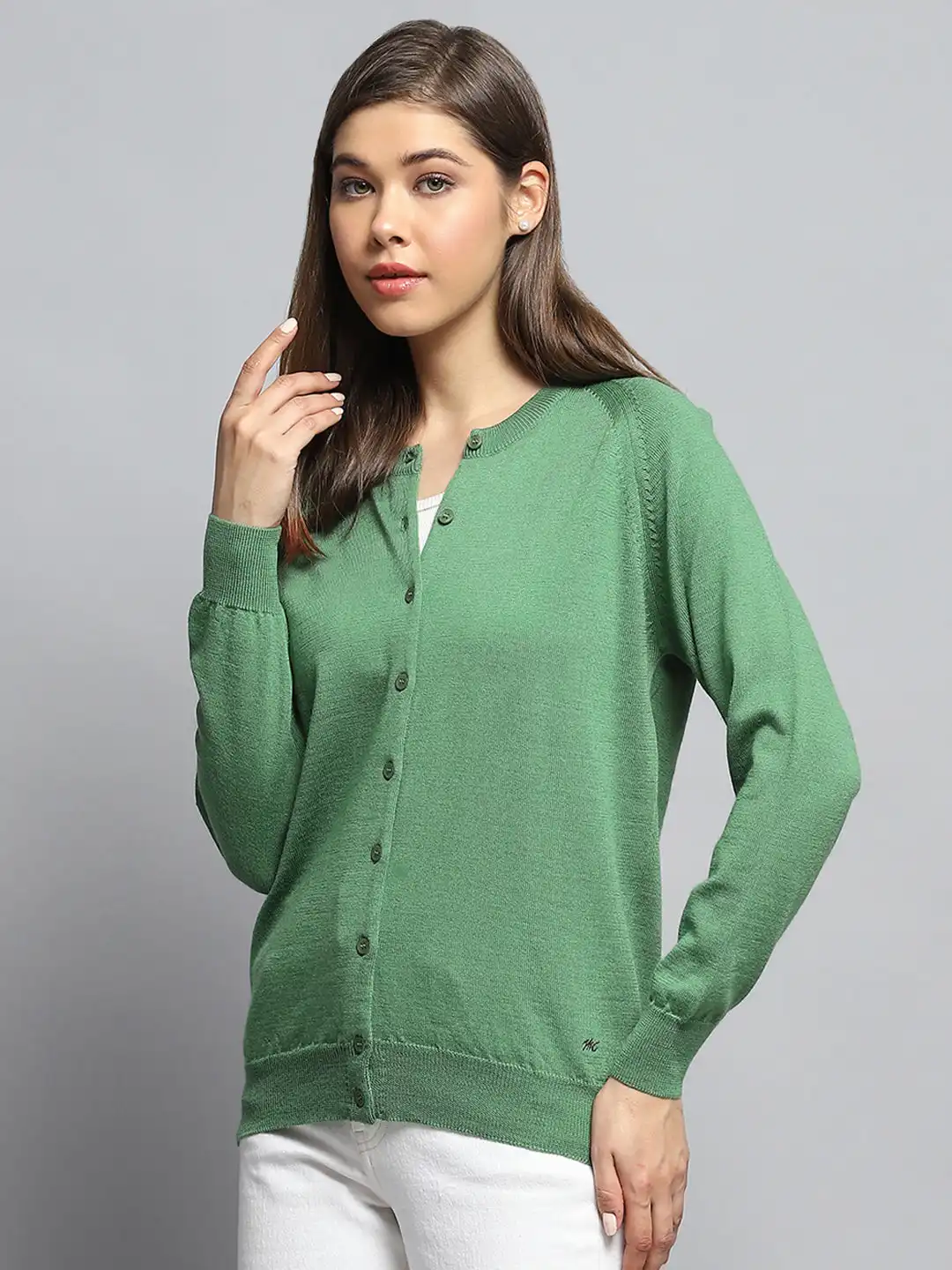 Women Green Solid Round Neck Full Sleeve Cardigan