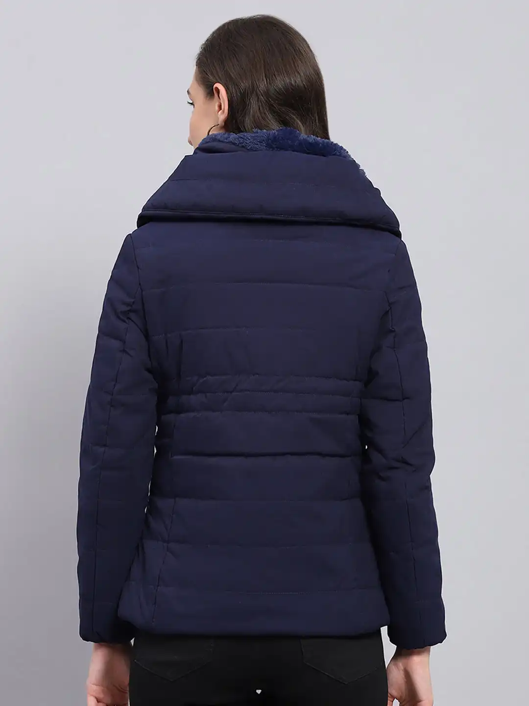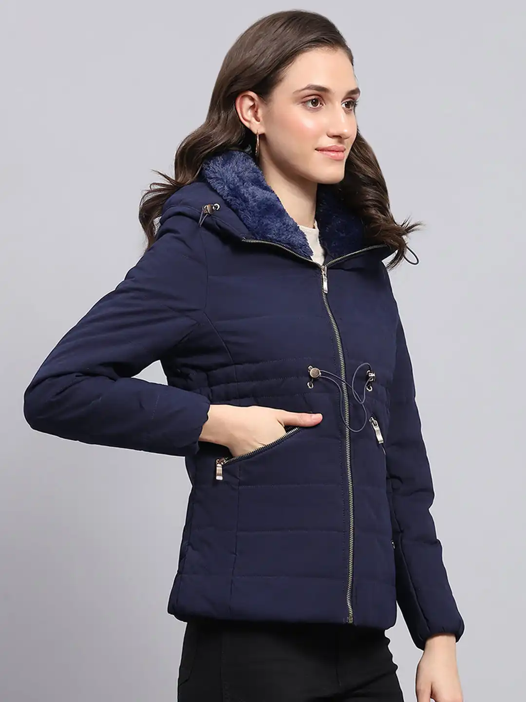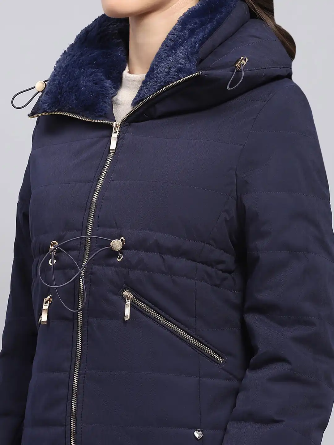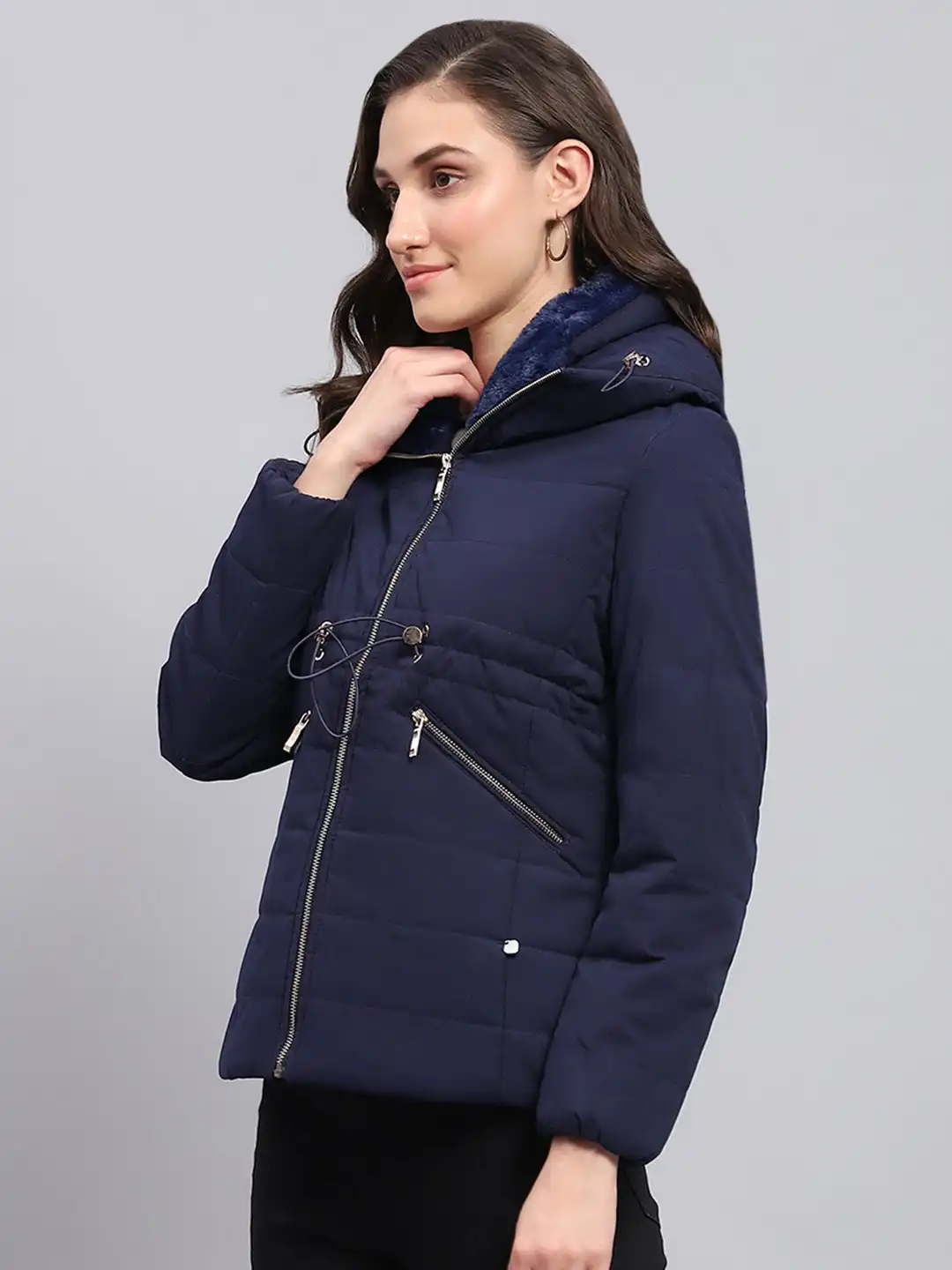 Women Navy Blue Solid Hooded Full Sleeve Jacket